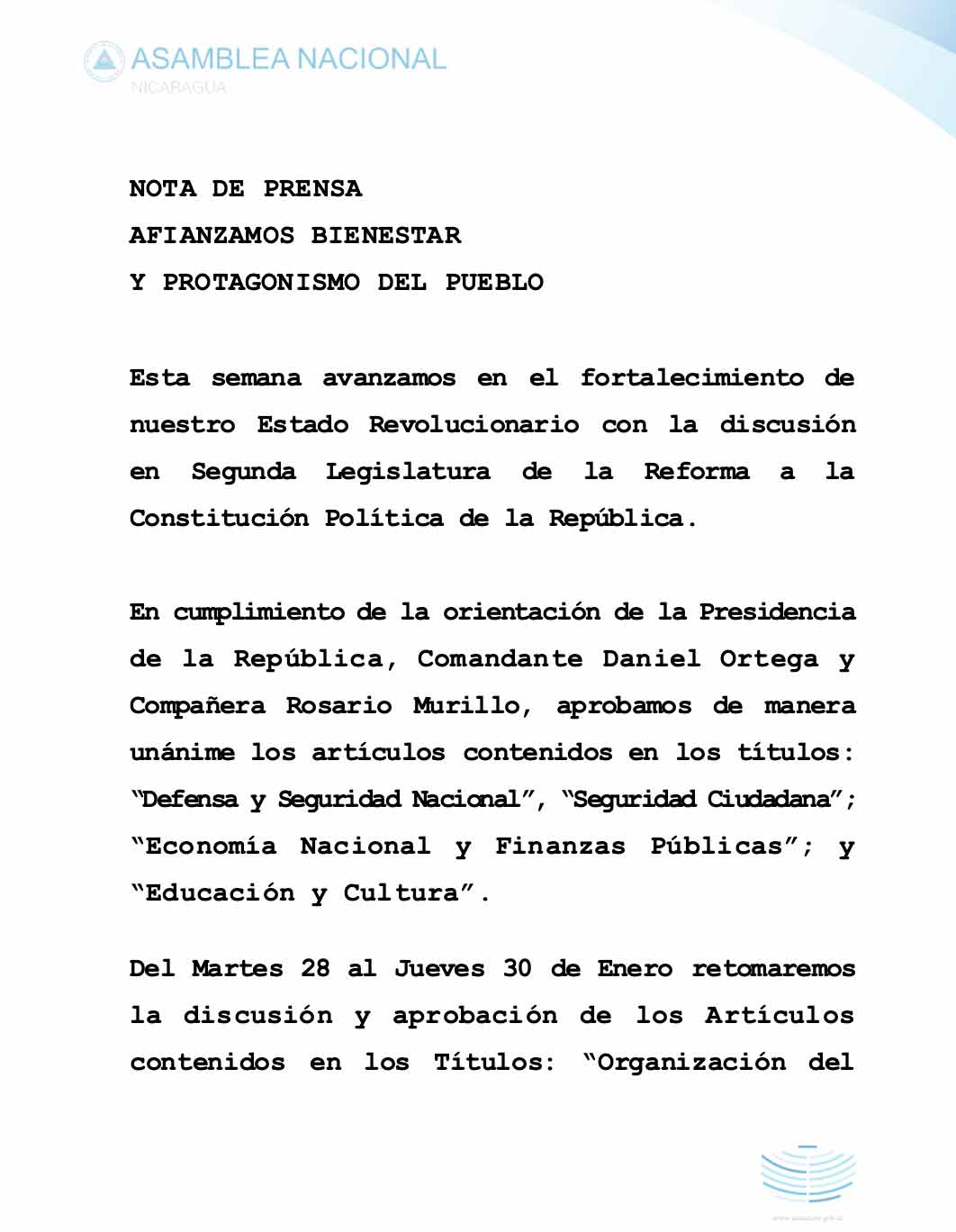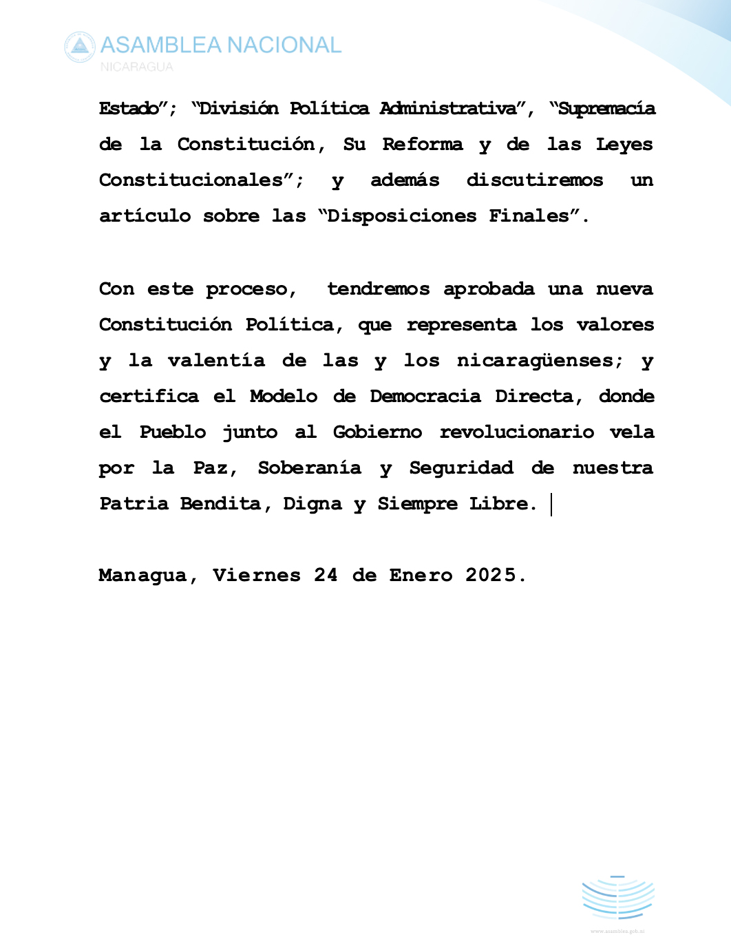 Con este proceso, el poder legislativo tendrá aprobada una nueva Constitución Política, que representa los valores y la valentía de las y los nicaragüenses; y certifica el Modelo de Democracia Directa, donde el Pueblo junto al Gobierno revolucionario vela por la Paz, Soberanía y Seguridad de nuestra Patria Bendita, Digna y Siempre Libre.