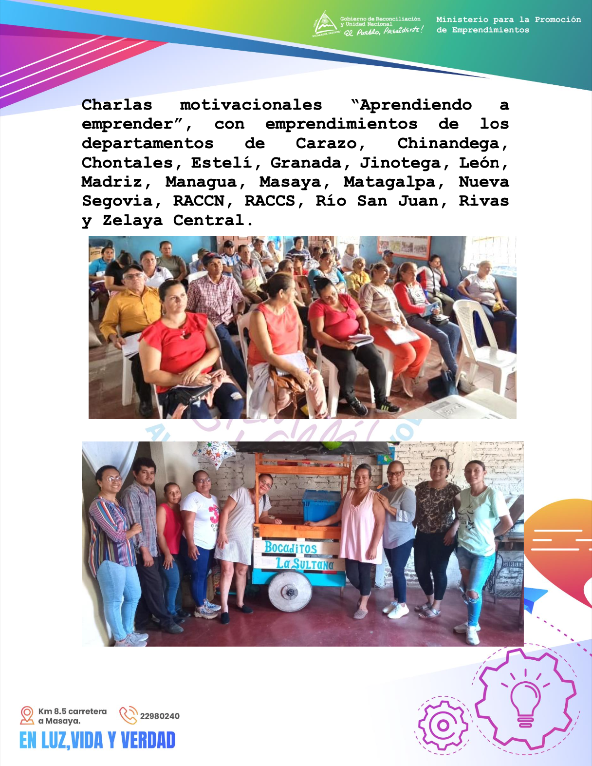 1. Charlas motivacionales “Aprendiendo a emprender”, con emprendimientos de los departamentos de Carazo, Chinandega, Chontales, Estelí, Granada, Jinotega, León, Madriz, Managua, Masaya, Matagalpa, Nueva Segovia, RACCN, RACCS, Río San Juan, Rivas y Zelaya Central.
