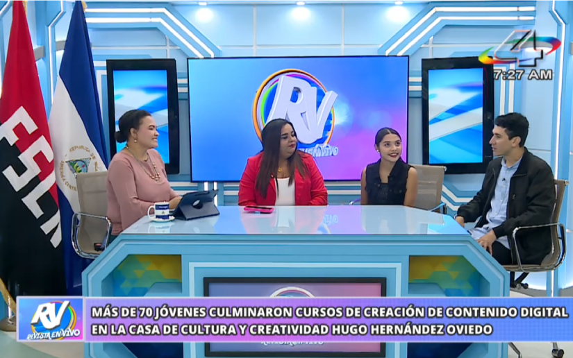 La responsable de la Casa de Cultura y Creatividad Hugo Hernández Oviedo, compañera Tania Libertad Torres, junto a los protagonistas de cursos, Dania Massiel Espinoza y Jorge Manuel Duarte García, participaron de la entrevista central, desarrollada este martes, 8 de julio, en la Revista en Vivo de Canal 4.