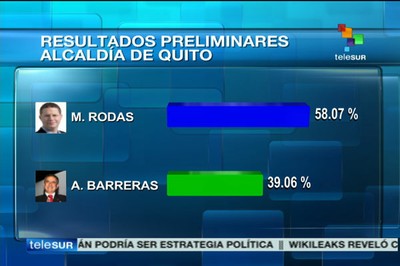 El alcalde de Quito y candidato a la reelección, Augusto Barrera, reconoció los resultados preliminares dados a conocer. "Reconocemos totalmente y le ponemos la cara a los resultados obtenidos", sostuvo durante la alocución ofrecida en la sede del comando de Alianza País en la capital ecuatoriana.