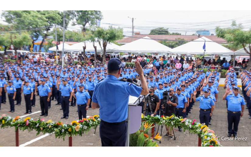 “Promesa de Ley: Prometes ante Dios, ante la patria, ante el pueblo y las familias nicaragüense, ante nuestros Héroes y Mártires, respetar la Constitución, las Leyes, los derechos y las libertades del pueblo y cumplir fielmente las misiones encomendadas bajo los principios fundamentales de actuación de la Policía Nacional, para defender la paz, la seguridad y la estabilidad de nuestra nación, revestidos por el lema de ¡Honor, Seguridad, Servicio! Sí así lo haces, que la patria y pueblo lo reconozcan, si no que ellos te lo demanden. Quedan juramentados”, citó el Primer Comisionado General.