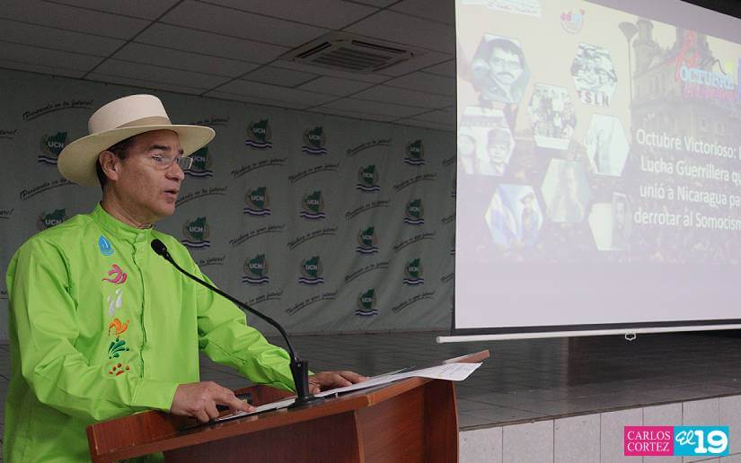 En sus palabras, recordó que “Octubre Victorioso, una insurrección ininterrumpida, desde octubre de 1977, hasta el 19 de julio de 1979, cuando el pueblo dio al traste con la dictadura, cruenta, sangrienta y violatoria de derechos humanos, la dictadura de los Somoza”.