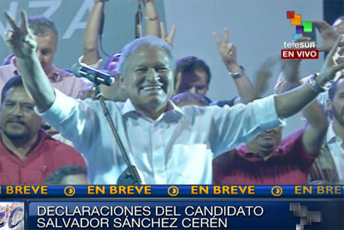 El candidato del Frente Farabundo Martí para la Liberación Nacional (FMLN), Salvador Sánchez Cerén, se dirigió al pueblo salvadoreño en horas de la noche de este domingo, para celebrar su victoria en los comicios presidenciales celebrados etse domingo, luego del primer reporte oficial del del Tribunal Supremo Electoral (TSE) del país centroamericano.