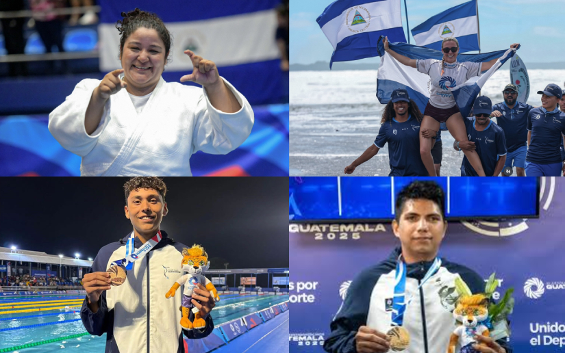 A continuación detalló: "Medallas de oro, son 7 las que hemos conquistado: Izayana Marenco en judo, Candelaria Resano en surfing, Erick Blandón en natación, Carlos Arteaga en atletismo, lanzamiento de martillo, Esperanza Sibaja, atletismo, lanzamiento de jabalina, natación, Erick Blandón, 50 metros dorso".