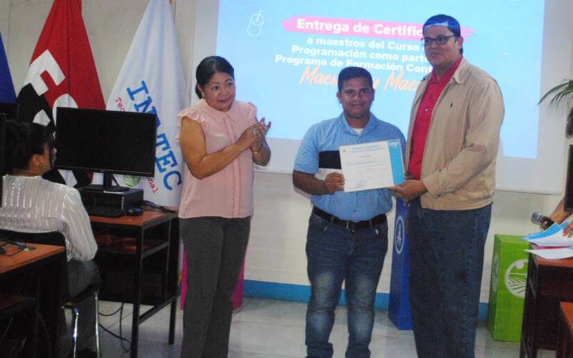 Mirna Cuesta, responsable del Departamento de Programas Educativos de Inatec, indicó que son 13 docentes que recibieron certificados y también podrán realizar una réplica en la metodología cascada a más de cien docentes del Tecnológico Nacional y estudiantes de la carrera del Técnico de Especialistas en Programación y los que llevan los cursos derivados de estas carreras.