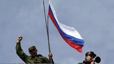Cuando los manifestantes lograron izar la bandera rusa, empezaron a cantar el himno ruso.