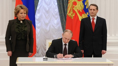El presidente de Rusia, Vladímir Putin, firma la ley sobre la adhesión de la República de Crimea y de la ciudad de Sebastopol a la Federación de Rusia.