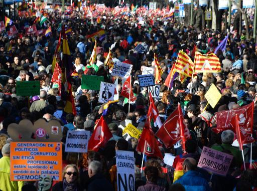 Seis columnas llegadas de diversas regiones del país fueron formadas para condenar la política del conservador jefe del Gobierno, Mariano Rajoy, en 35 manifestaciones en toda la ciudad para converger luego en la Plaza Colón.