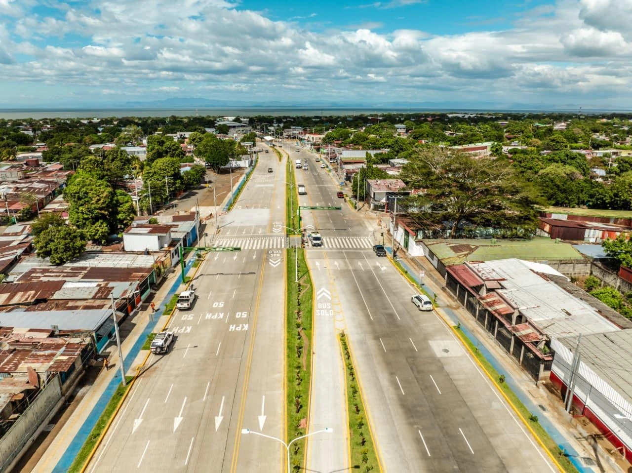 - Reconstrucción de 2.72 kilómetros de pista, ampliada a 8 carriles principales, con dos carriles exclusivos para el transporte colectivo urbano de Managua.