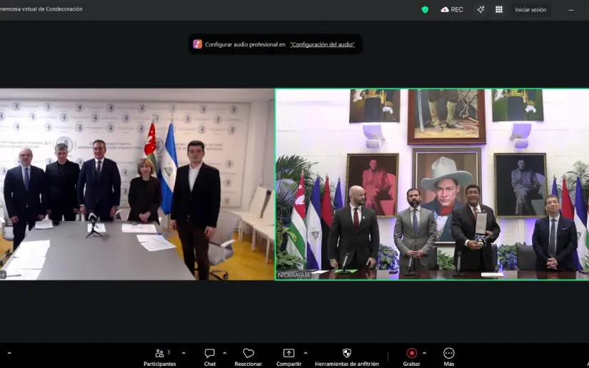 La Ceremonia, que se realizó de forma virtual, contó con la participación de los Compañeros Oleg Bartsits, Ministro de Asuntos Exteriores de Abjasia; Inar Lariya, Ex Embajador; Alias Aiba, Encargado de Negocios de la Embajada de Abjasia en Nicaragua y Compañer@s de la Cancillería de Abjasia, quienes transmitieron los Saludos del Presidente Badra Gunba a nuestros Co-Presidentes de la República, así como el sincero agradecimiento por el Firme Apoyo de Nicaragua al Pueblo Abjasio, resaltando la importancia de continuar consolidando los Vínculos de Amistad, Solidaridad y Cooperación entre nuestros Pueblos.