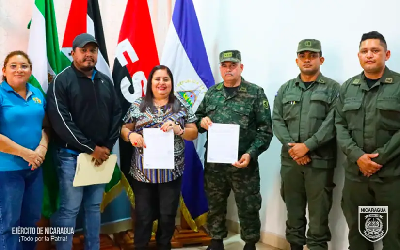 El Ejército de Nicaragua consecuente con el lema de que “Somos el Pueblo mismo uniformado trabajando en su propio beneficio”, el 15 de abril de 2026, a través del jefe del Cuerpo de Ingenieros “General de Brigada Miguel Ángel Ortez y Guillén”, Coronel Ing. DEM Omar Joaquín Montenegro Martínez, participó en firma de convenio con la alcaldesa del municipio de Masaya, departamento de Masaya, doctora Janina del Socorro Padilla Noguera, para el desarrollo de un proyecto de rehabilitación y mejoramiento de camino rural.