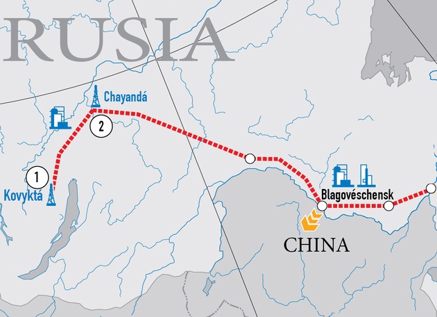 El gasoducto Fuerza de Siberia tendrá una longitud aproximada de 4.800 kilómetros. Su infraestructura reunirá los recursos de los yacimientos de Chayandá y Kovyktá, en Siberia oriental.