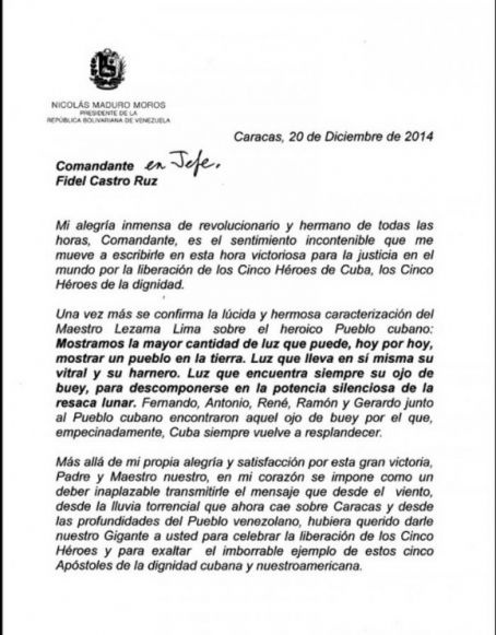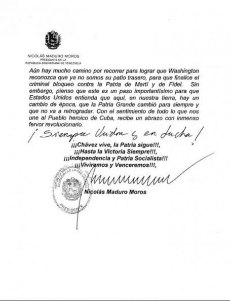 Los presidentes Barack Obama y Raúl Castro sorprendieron al mundo al anunciar que restablecerán relaciones diplomáticas, rotas en 1961. "Aún hay mucho camino por recorrer para lograr que Washington reconozca que ya no somos su patio trasero, para que finalice el criminal bloqueo" sobre la isla, vigente desde 1962, indicó Maduro en su misiva a Raúl Castro.