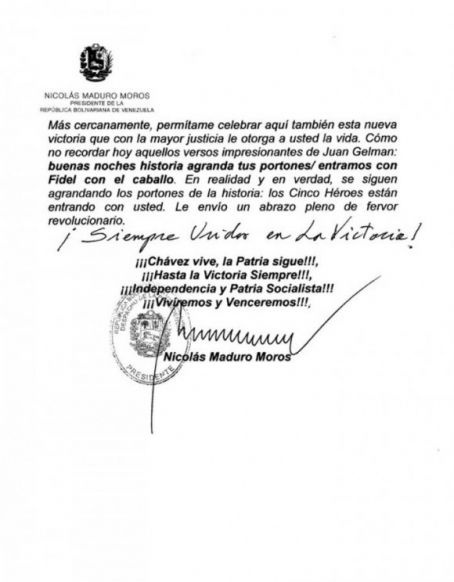 "Mucho más que una buena nueva, es la posibilidad cierta de que Estados Unidos reconozca el derecho sagrado que tiene Cuba a existir libre y soberanamente", dijo Maduro en su carta a Raúl, sobre la histórica reconciliación entre Washington y La Habana anunciada el 17 de diciembre.