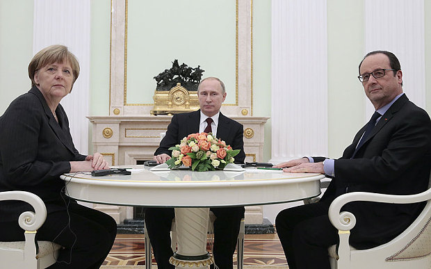 El presidente de Rusia, Vladímir Putin, la canciller alemana, Angela Merkel, y el presidente francés, François Hollande, han mantenido "negociaciones constructivas" en Moscú que desembocarán en un documento para resolver la situación en Ucrania, dijo el portavoz presidencial, Dmitri Peskov.