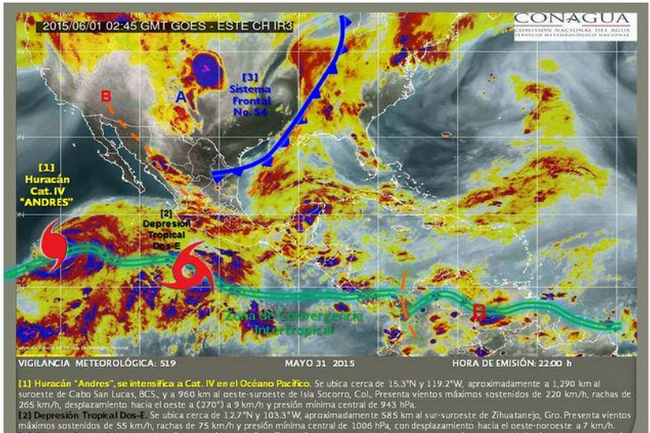 Andrés se ubica a 1,350 kilómetros al suroeste de Baja California Sur y se desplaza en dirección oeste-noroeste alejándose de la costa mexicana, señaló el CNH.