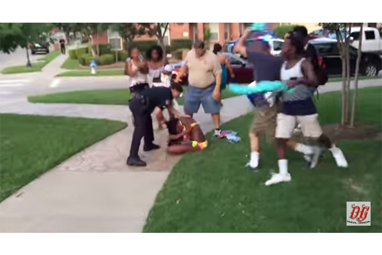 En una caótica escena en la que se puede ver a adolescentes corriendo en la zona de la piscina para evadir a la policía, un oficial tira a una chica negra al suelo y la sujeta, desenfundando luego su arma cuando dos jóvenes negros se aproximan, aparentemente para interceder por ella.