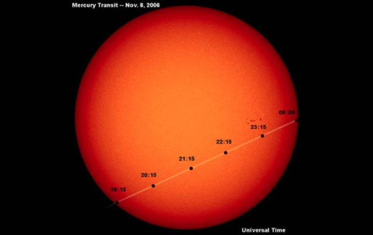 Mercurio estará en tránsito solar el lunes. El primer planeta de nuestro sistema solar semejará un diminuto punto negro al pasar frente al Sol. La NASA dijo que eso ocurre sólo unas 13 veces por siglo.