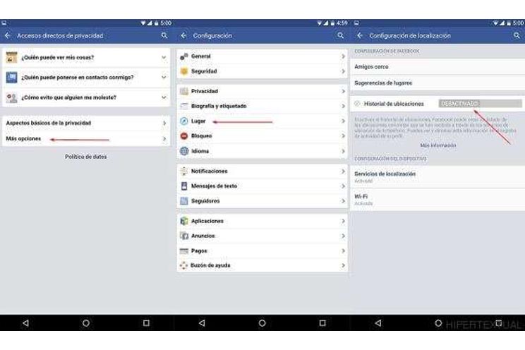 Para desactivar los servicios de localización, presiona el botón de configuración de la app de Facebook, elige la opción Accesos directos de privacidad, luego haz clic en Más opciones, y por último, accede al apartado Lugar. Desde ahí puedes desactivar los servicios de ubicación permanentemente.