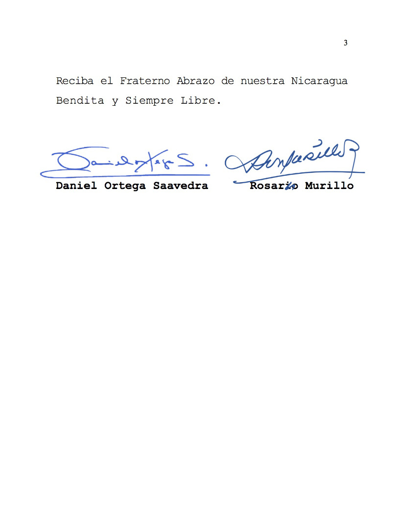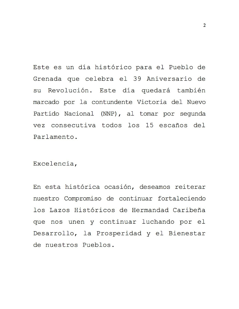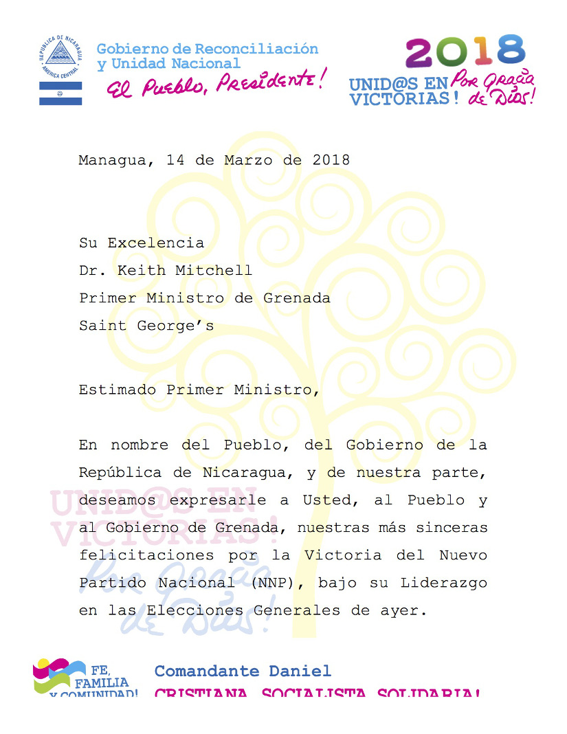 En nombre del Pueblo, del Gobierno de la República de Nicaragua, y de nuestra parte, deseamos expresarle a Usted, al Pueblo y al Gobierno de Grenada, nuestras más sinceras felicitaciones por la Victoria del Nuevo Partido Nacional (NNP), bajo su Liderazgo en las Elecciones Generales de ayer.