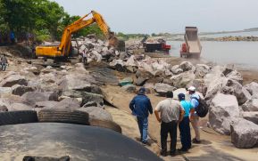 Autoridades del Sinapred, alcaldía municipal, MTI y empresa portuaria nacional realizaron un recorrido en el sector de la zona costera del Municipio de Corinto donde se están instalando geocontenedores para proteger a las familias de los fuertes oleajes.
