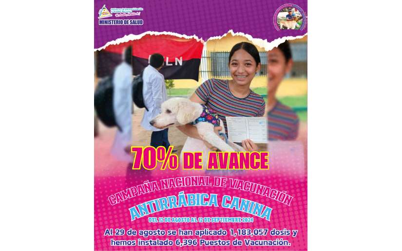 Junto a las familias nicaragüenses y la Red Comunitaria, estamos desarrollando la Campaña Nacional de Vacunación Antirrábica Canina para aplicar 1,700,000 dosis en perros, que termina el 12 de septiembre del año 2024.